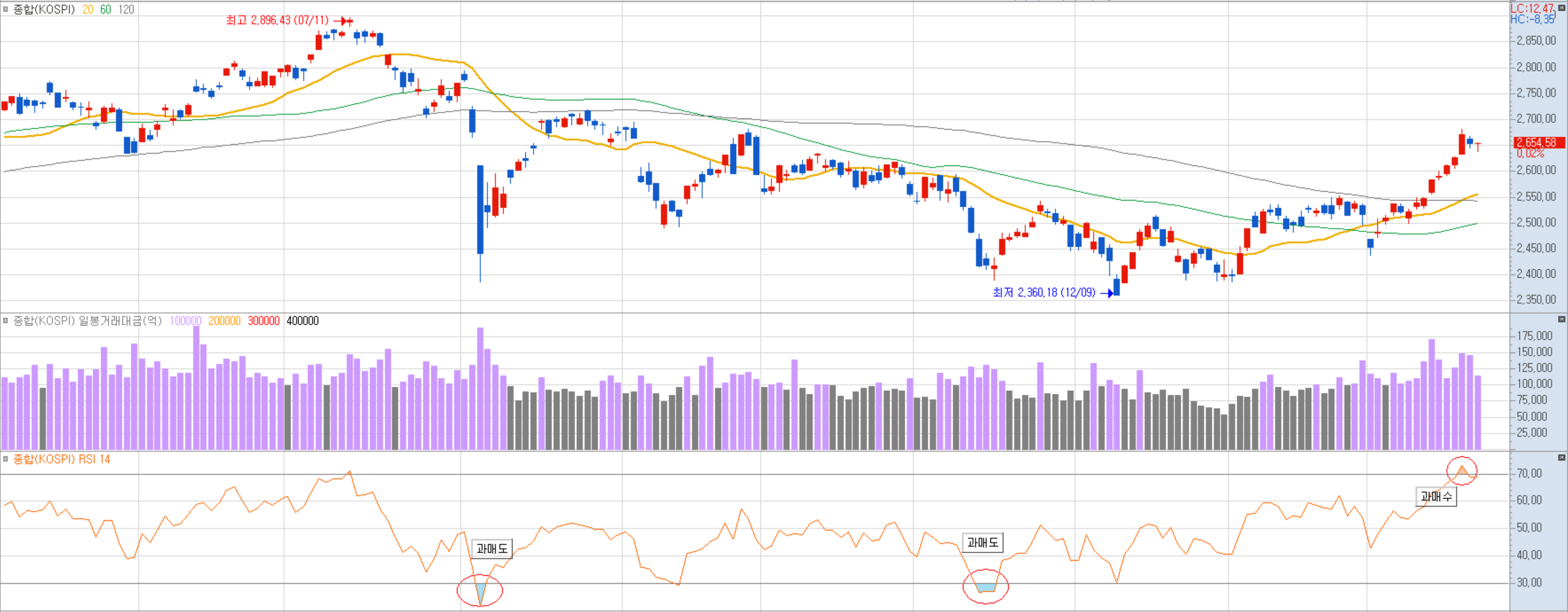 RSI는 가격의 상승과 하락의 상대적인 강도를 측정하는 지표로, 0에서 100까지의 값을 가집니다.