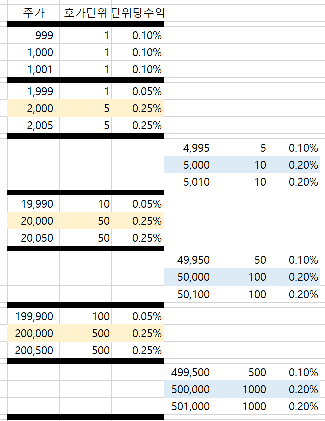 자세한 설명보다 아래 표에서 호가단위당 수익률을 보시면 직관적으로 이해하실 듯...